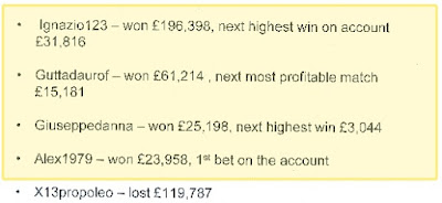 We can see that there were four accounts that won significant amounts of money on Vassallo Argüello in this match and the Argentinian account that lost almost £120,000. What you might notice is that the account that won the largest amount of money is 'Ignazio123'. If you look back at the Potito Starace match at Wimbledon, this is the same account that was backing the 3-0 there. The other three accounts are also based in Sicily. The report concludes: